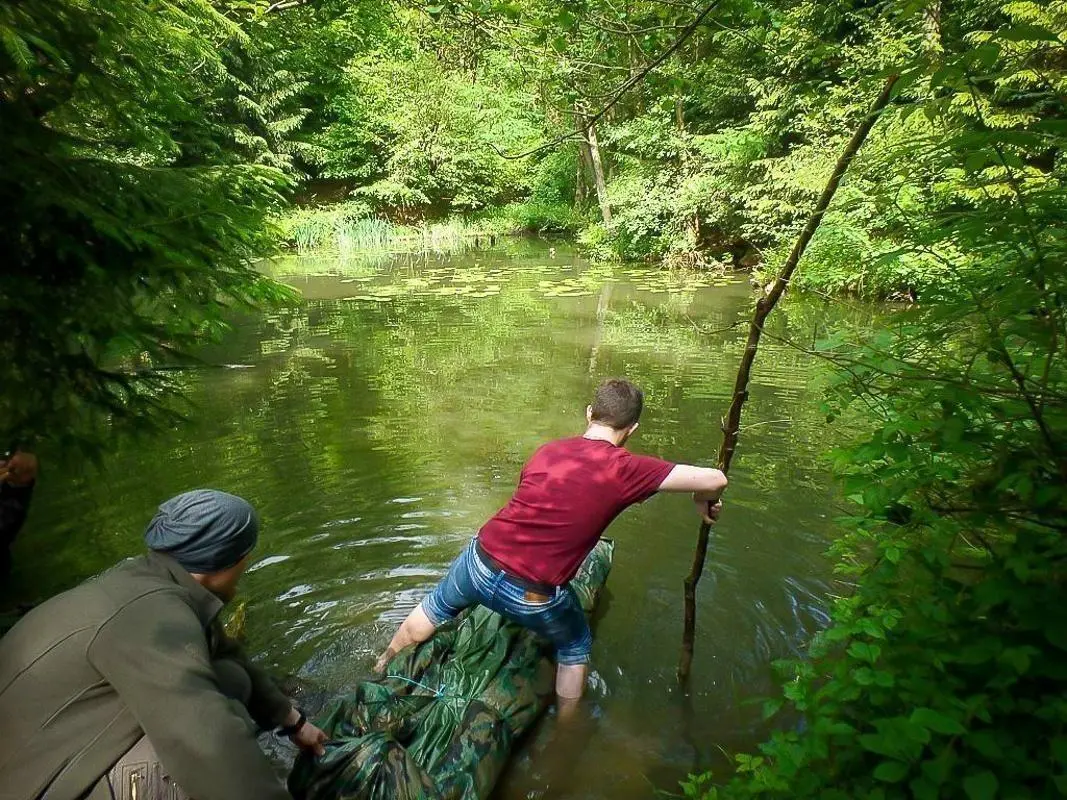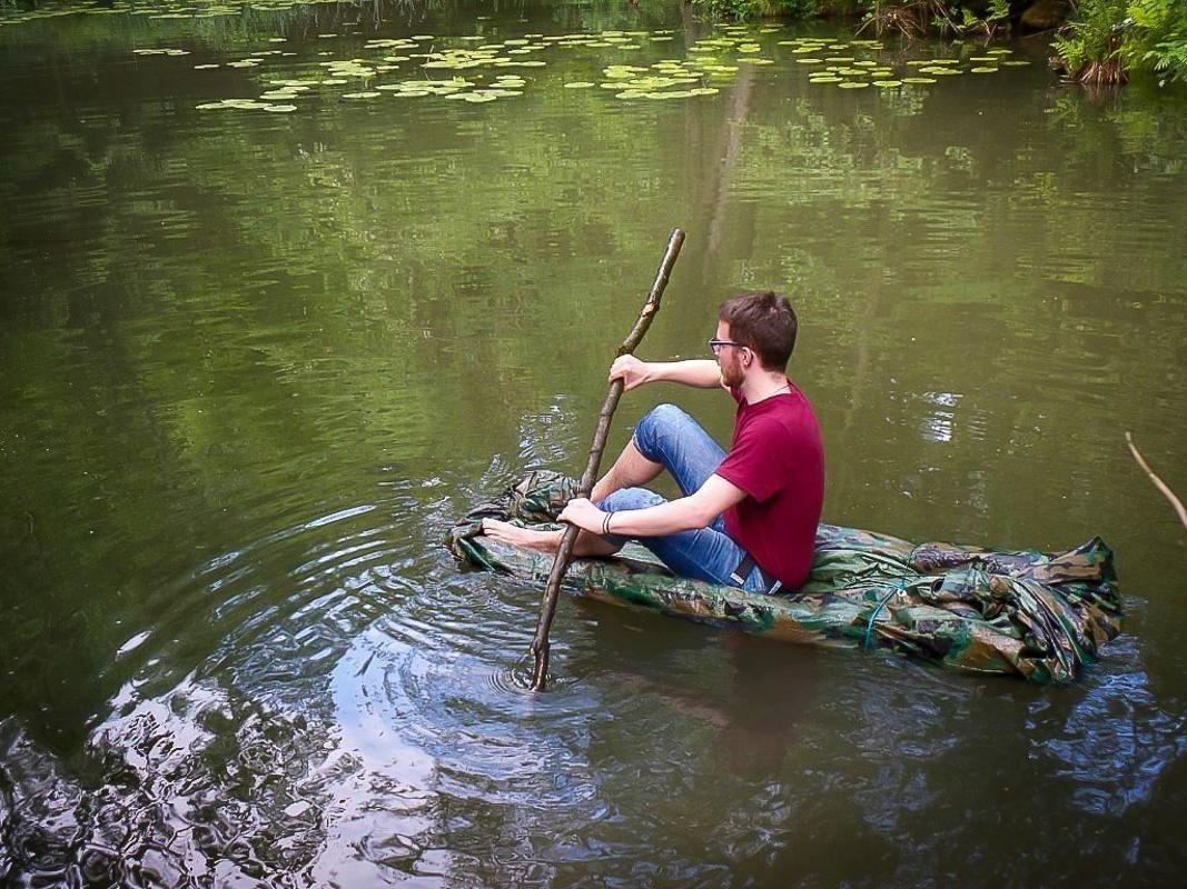 Mann paddelt auf improvisiertem Floß durch ruhiges Wasser mit Seerosen