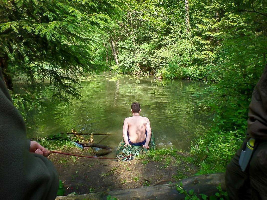 Mann steht im Wasser eines kleinen Gewässers, umgeben von Bäumen und Pflanzen