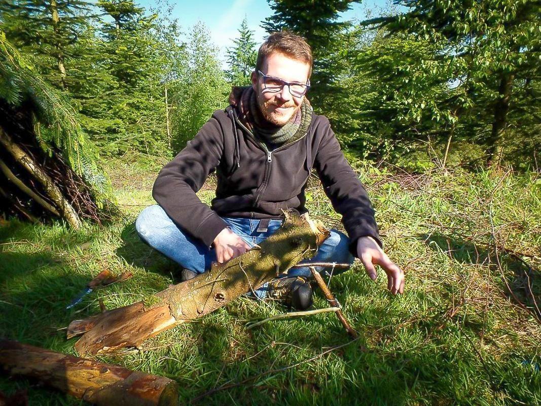 Mann sitzt auf dem Boden und arbeitet an einer Holzstruktur mit einem Messer