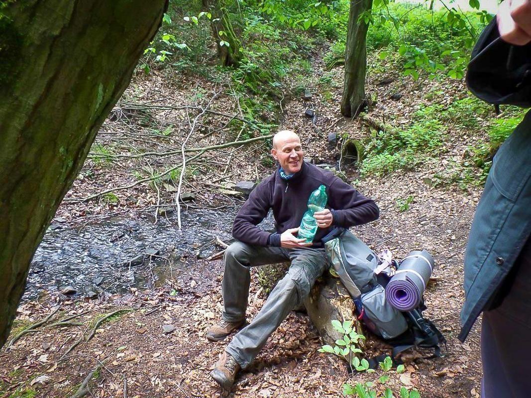 Gruppe sitzt im Wald, Rucksäcke liegen auf dem Boden, Wasserlauf im Hintergrund