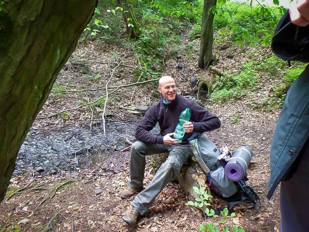 Mann sitzt auf einem Baumstumpf und hält eine Wasserflasche in der Hand