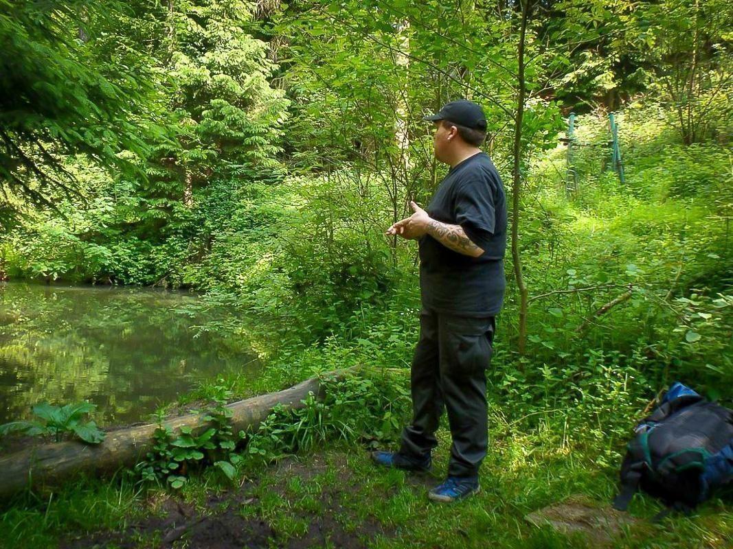 Mann steht am Ufer eines kleinen Gewässers, umgeben von dichter Vegetation