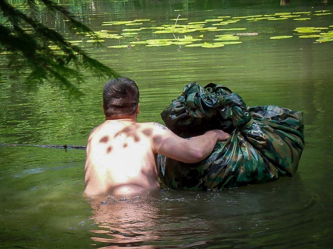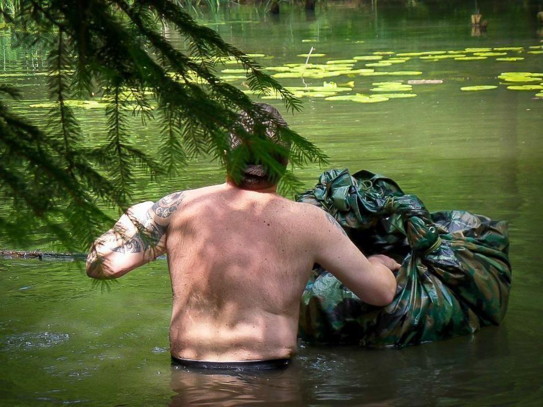 Mann zieht einen großen, camouflagierten Sack durch das Wasser