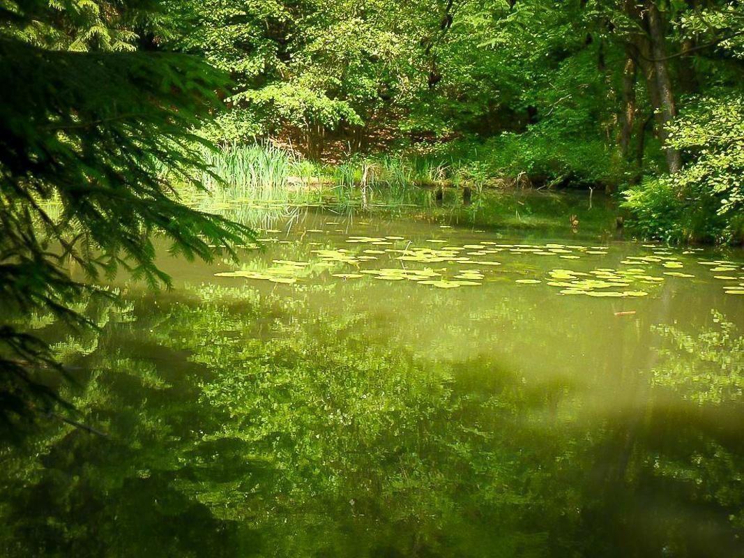 Ruhiger Teich mit Seerosen und spiegelndem Uferbewuchs