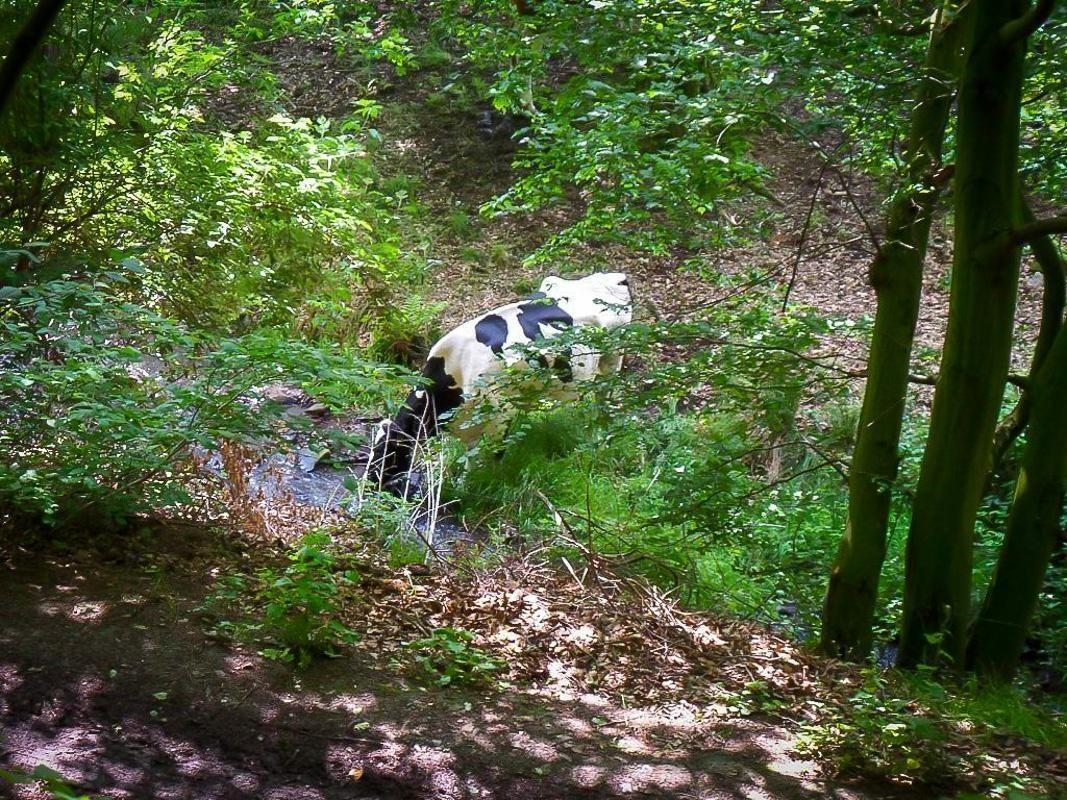 Schwarze und weiße Kuh steht im Wasser zwischen Bäumen und Sträuchern