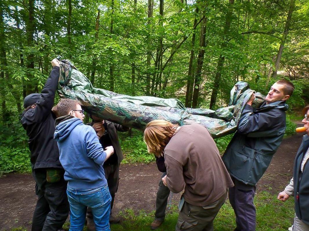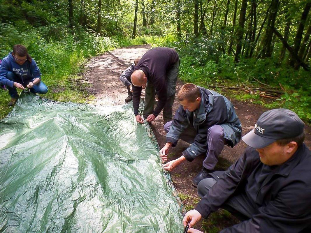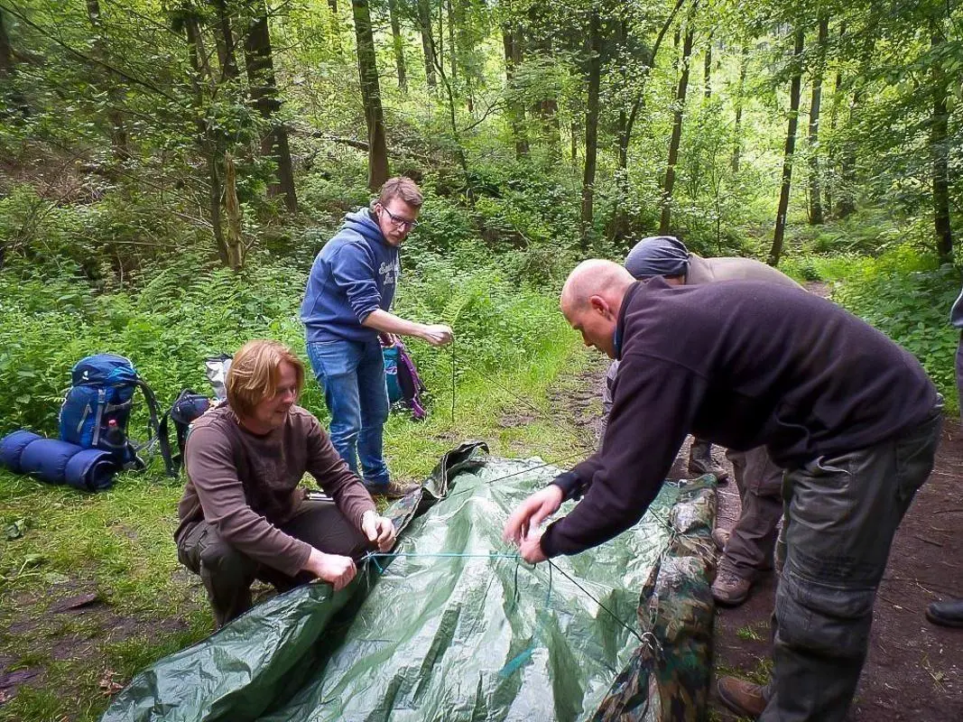 Gruppe arbeitet gemeinsam an einer Tarp-Notunterkunft im Wald