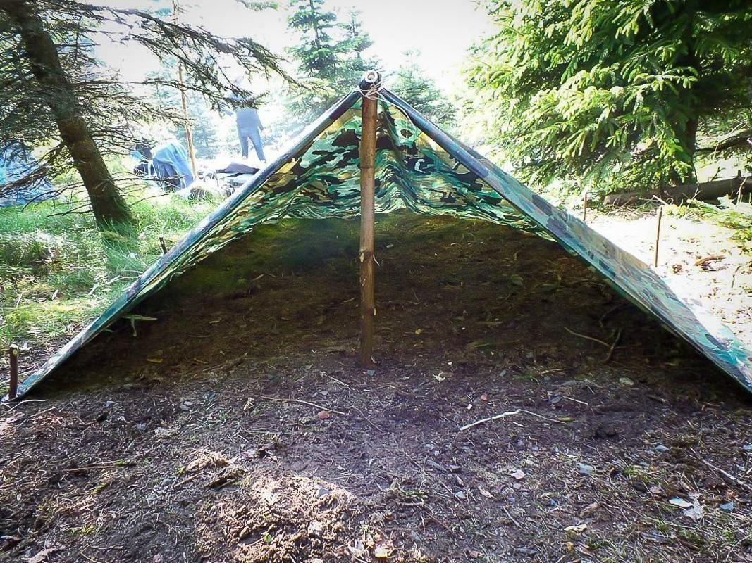 Tarp-Notunterkunft mit Holzstütze und Heringen im Wald aufgebaut