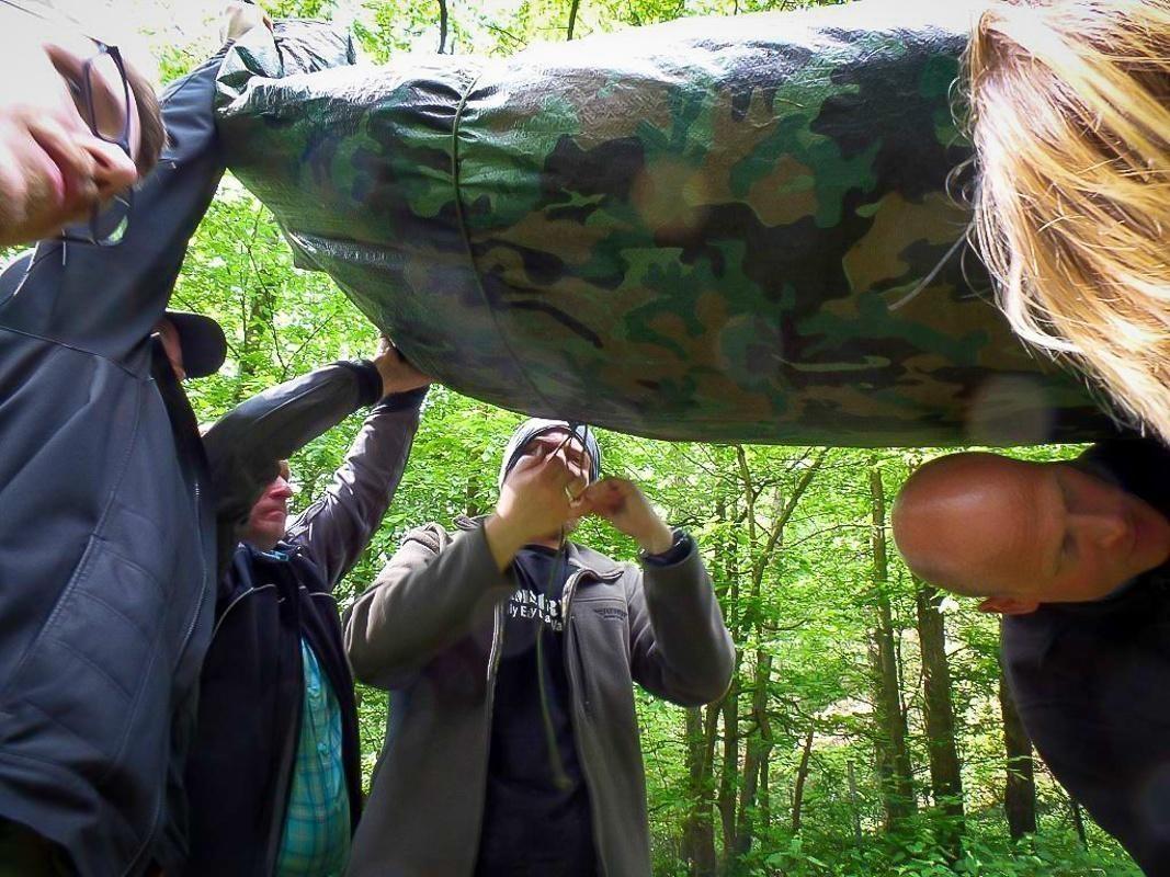 Sechs Personen arbeiten gemeinsam an der Aufstellung eines Tarps im Wald