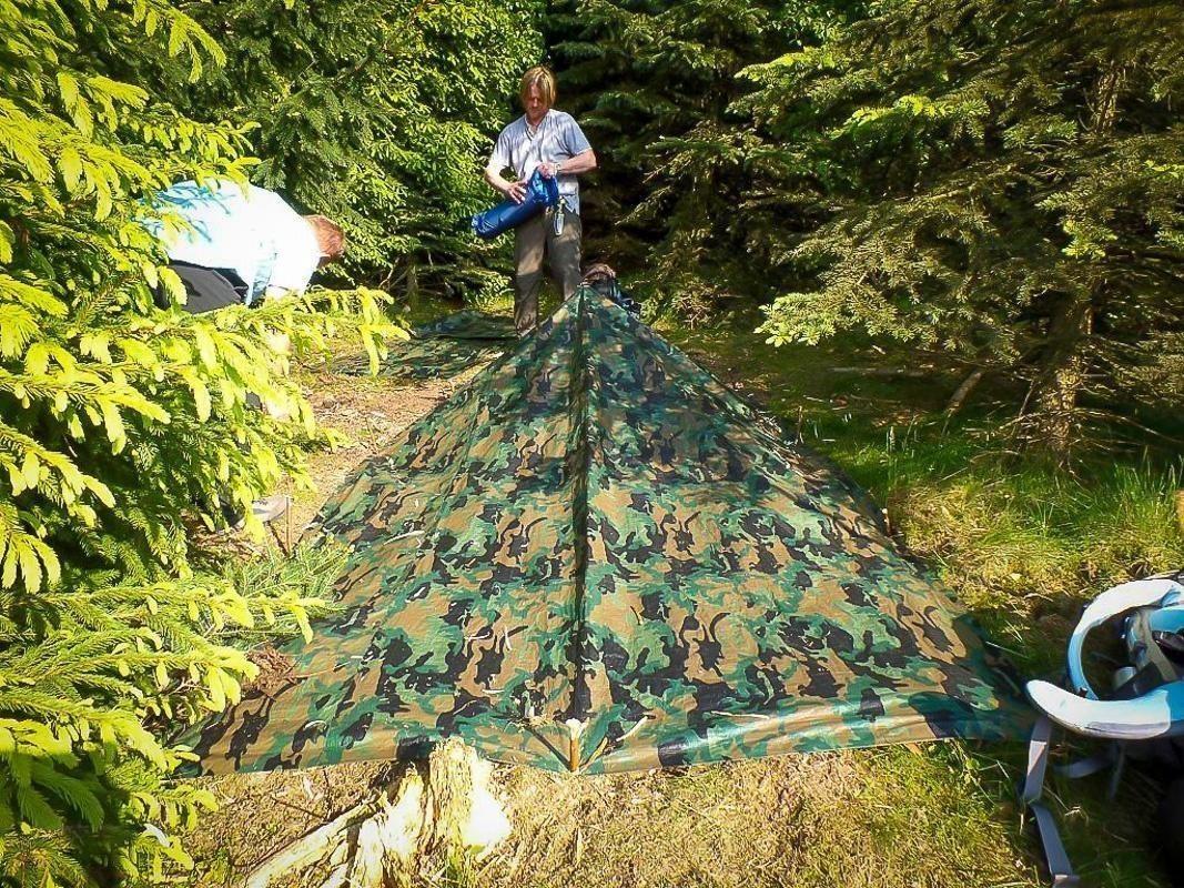 Tarp-Notunterkunft wird auf dem Boden ausgebreitet, Rucksack und Schlafsack liegen darauf