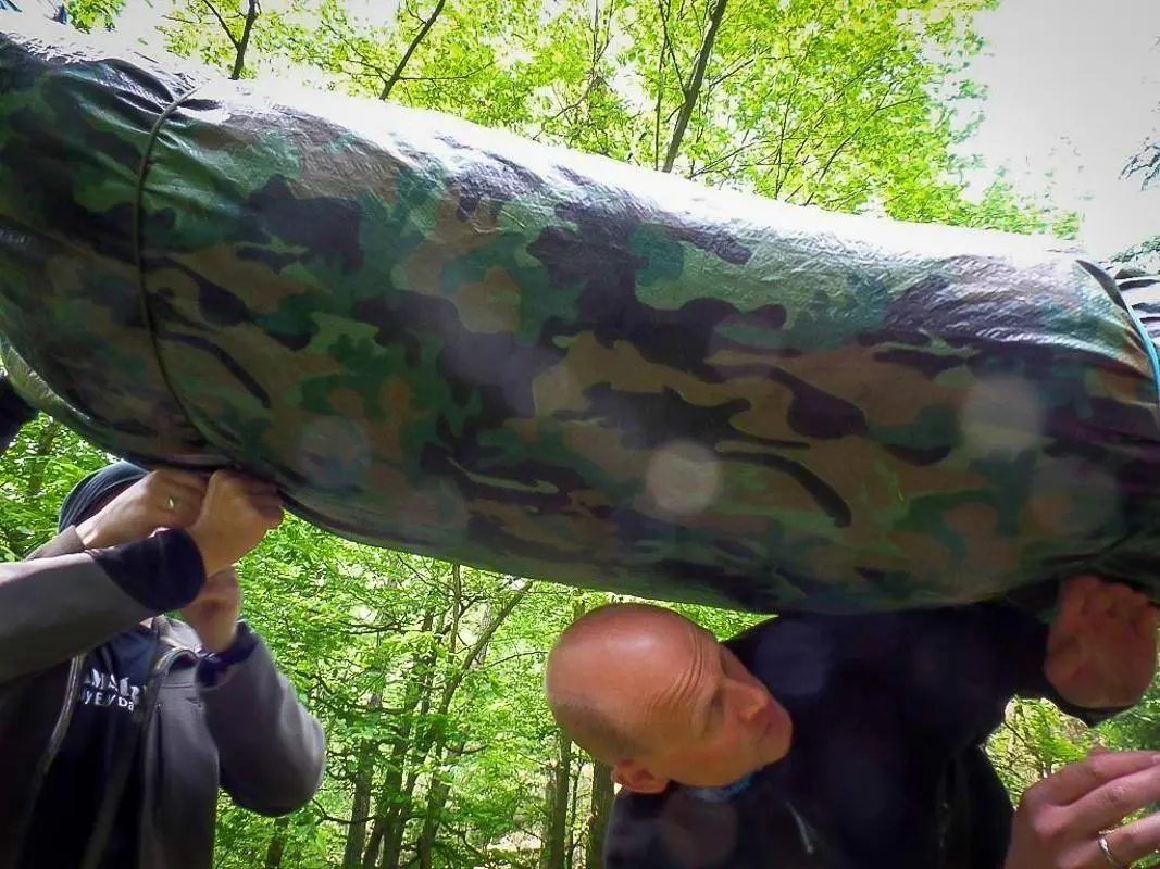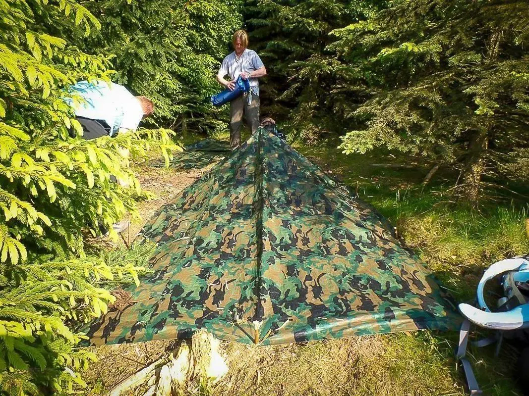 Fünf Personen heben eine camouflagefarbene Tarp-Notunterkunft auf einem Waldweg