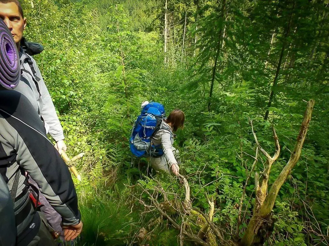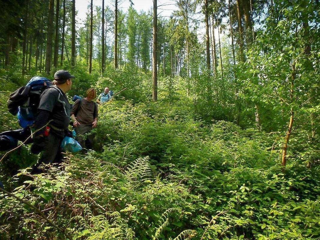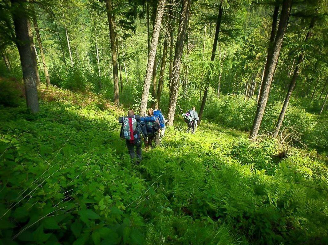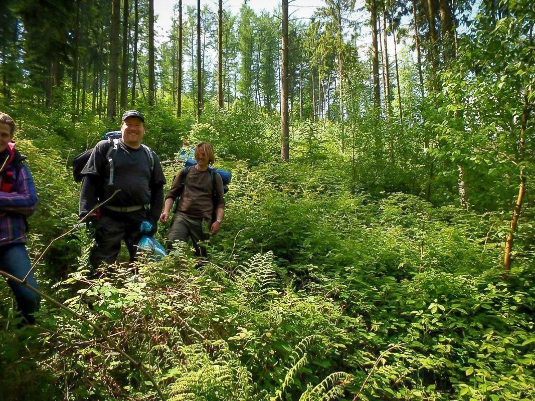 Wanderer mit Rucksäcken bewegen sich durch dichten Wald mit hohem Unterholz