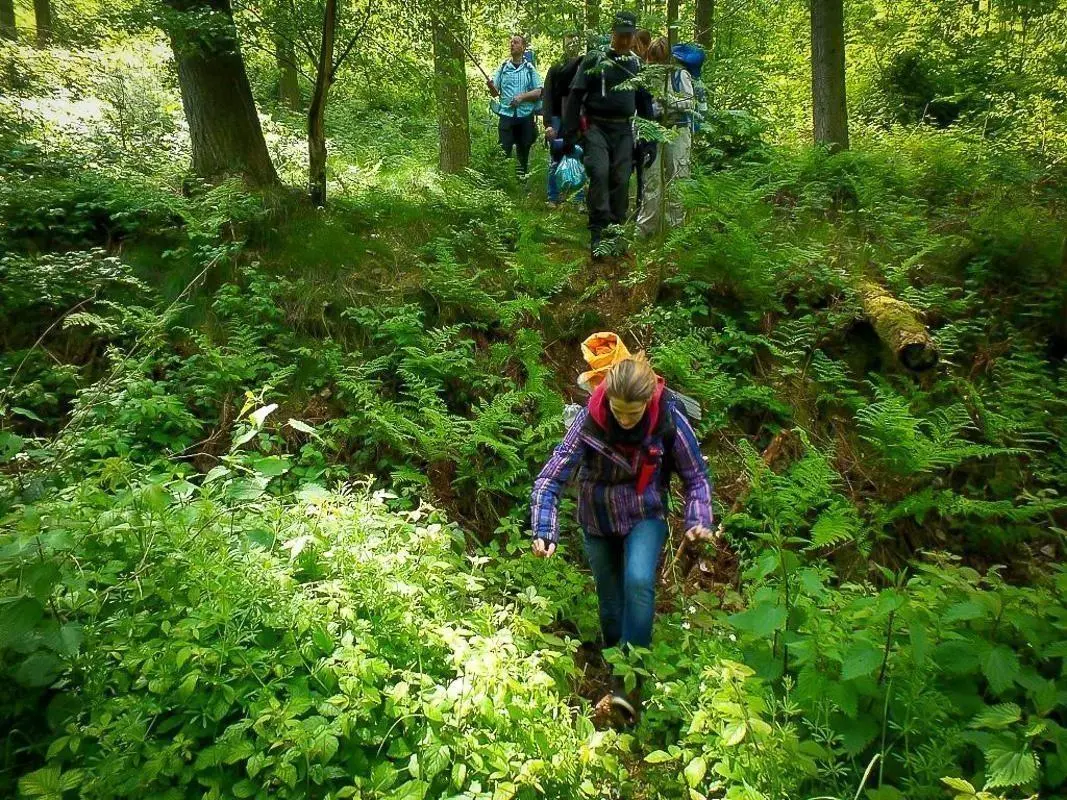 Wandernde Gruppe überquert unebenen Boden im Wald, umgeben von Pflanzen