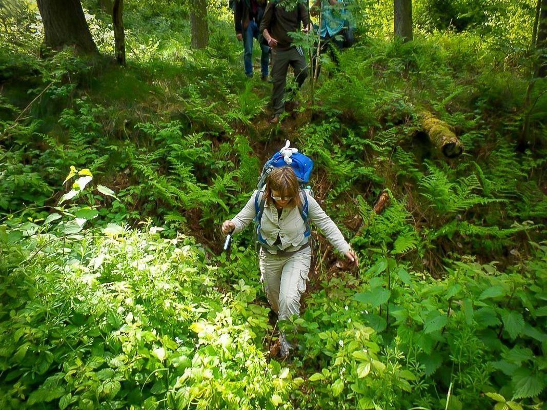 Wanderer steigen einen steilen Hang im Wald hinauf, umgeben von dichtem Grün