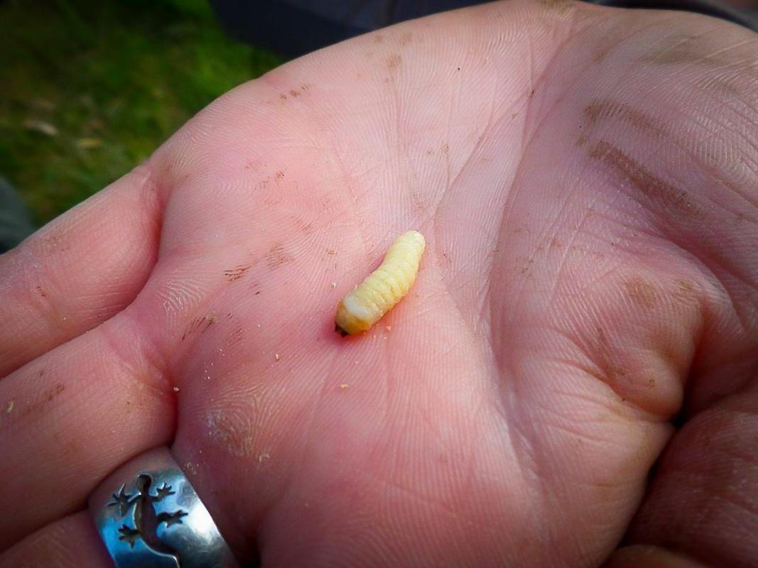 Wurm liegt auf einer Handfläche mit sichtbaren Schmutzflecken