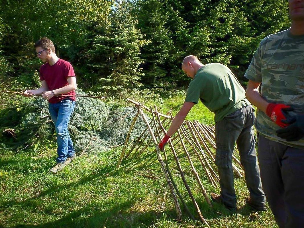 Drei Personen arbeiten an einer improvisierten Unterkonstruktion aus Ästen und Gras