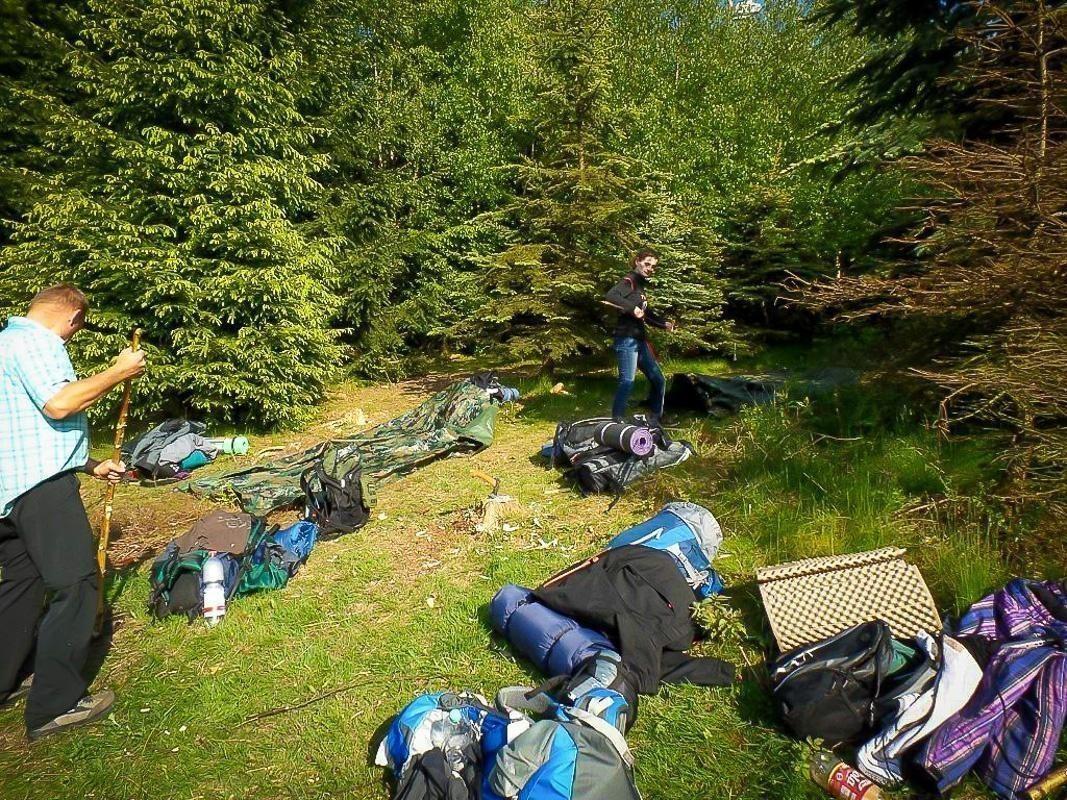 Zwei Personen sortieren Rucksäcke und Ausrüstung im Wald