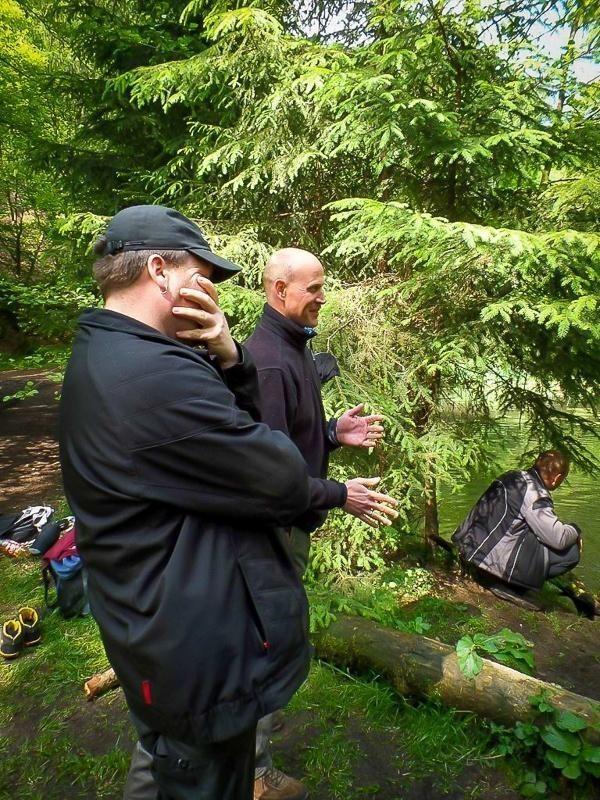 Zwei Männer lachen und stehen in einem Waldgebiet neben einem Gewässer