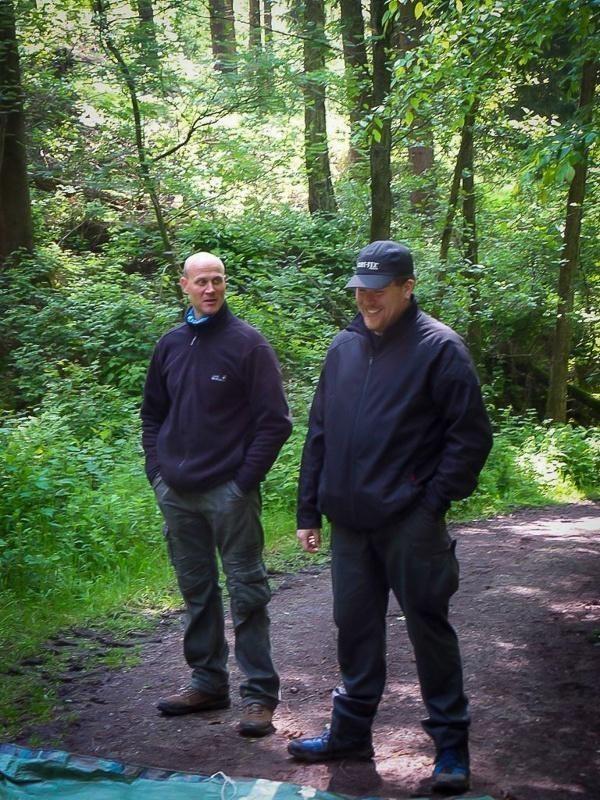 Zwei Männer stehen in einem Wald und unterhalten sich
