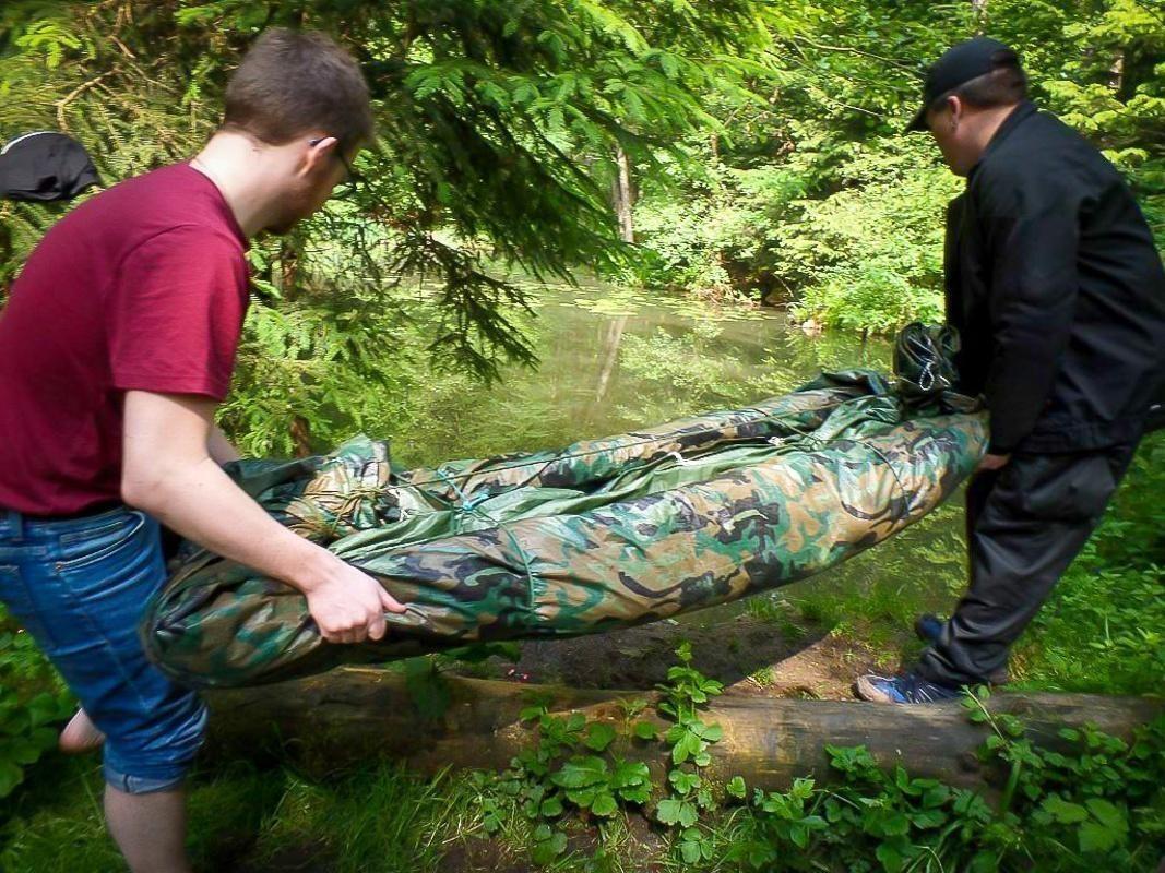 Zwei Personen heben eine camouflagefarbene Tarp-Notunterkunft am Ufer eines Gewässers