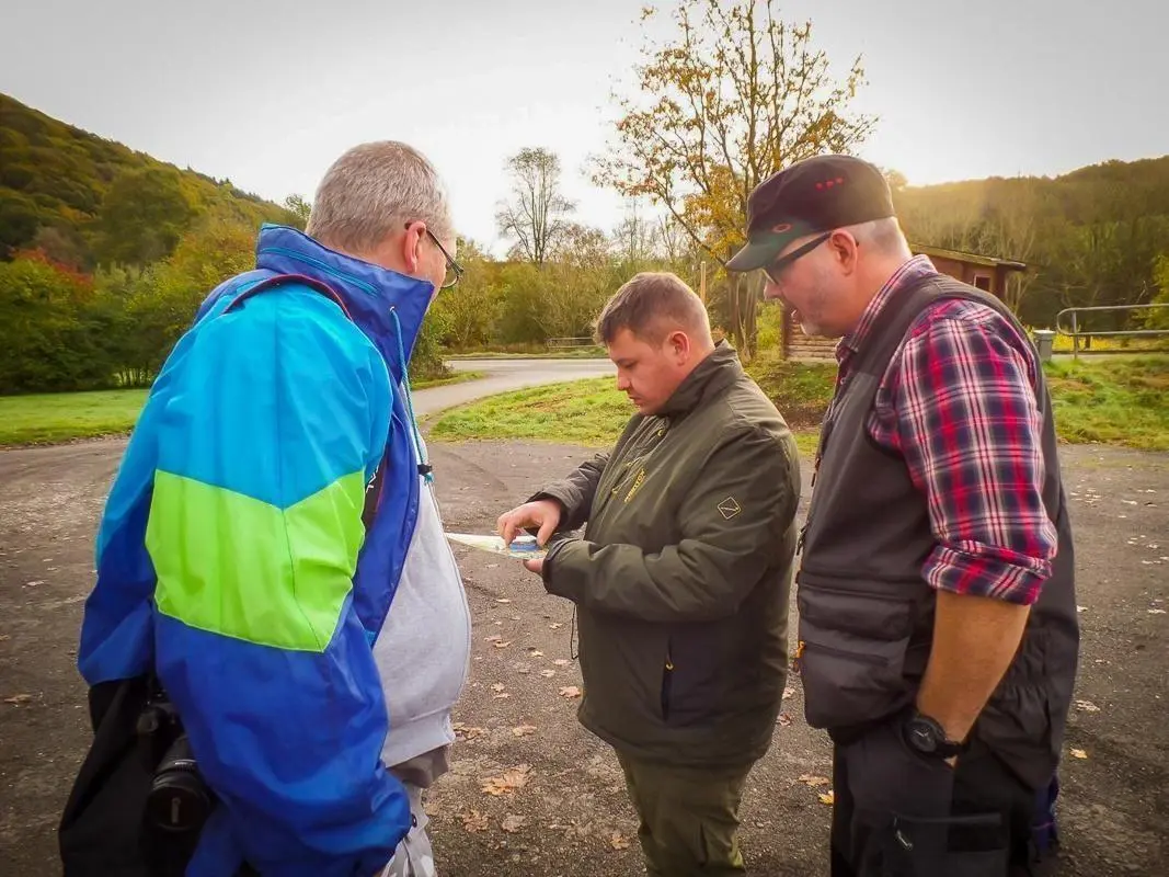 Drei Personen betrachten eine Karte auf einem Parkplatz in der Natur
