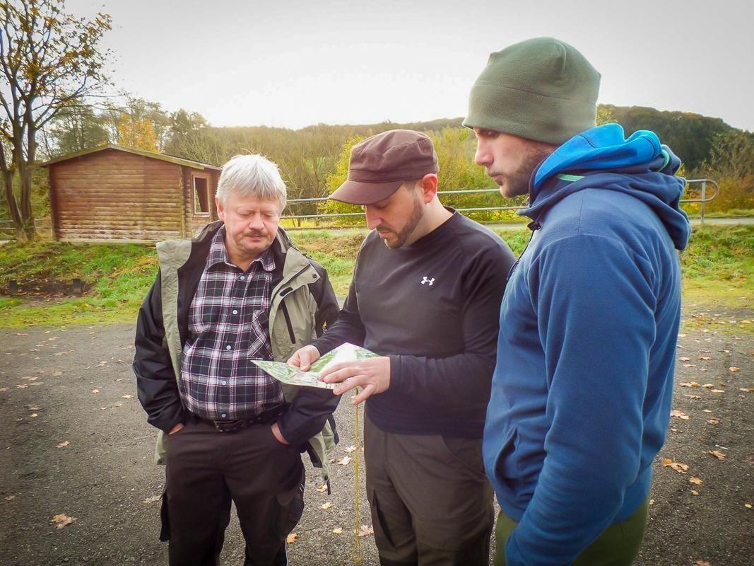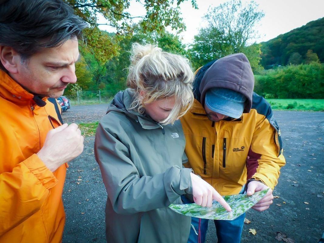 Drei Personen betrachten eine Karte im Freien, umgeben von Bäumen und einer Holzhütte