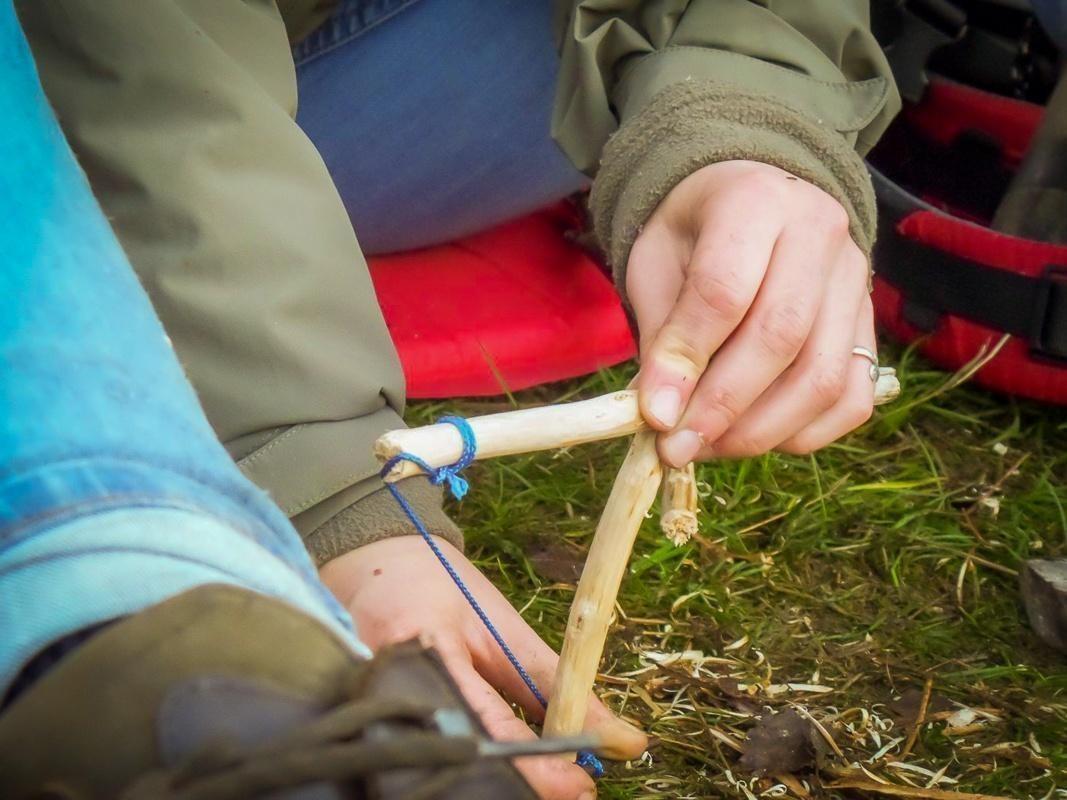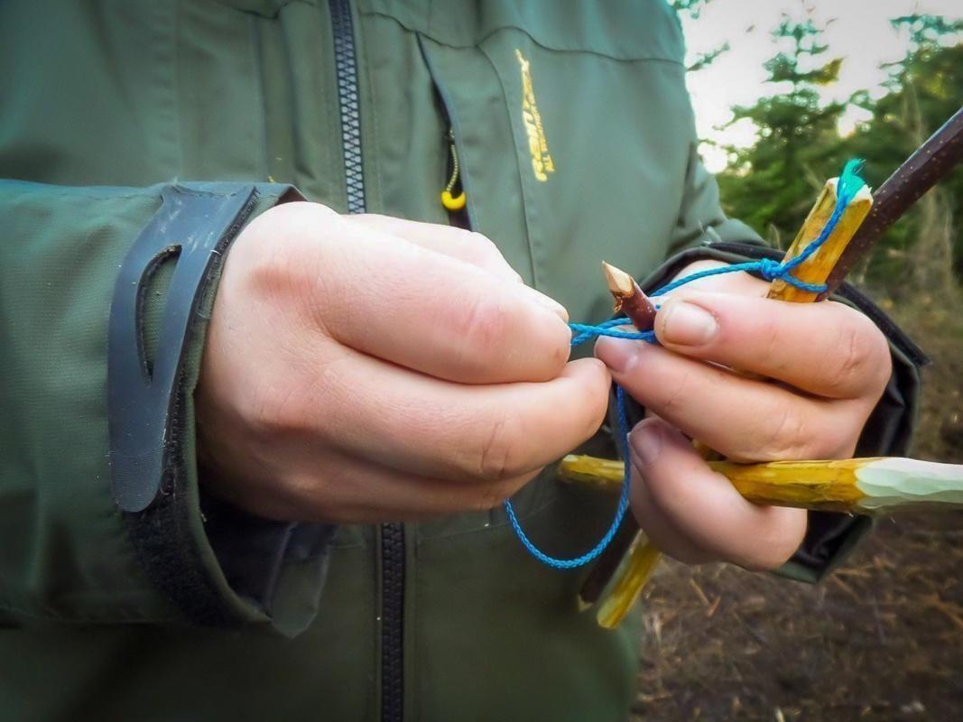 Hände binden eine Schnur um einen Holzstock zur Konstruktion