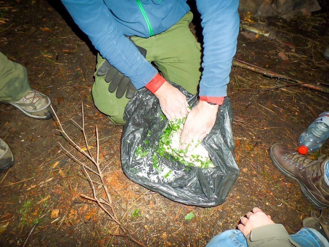 Hände kneten Kräuter in einer schwarzen Plastiktüte im Wald