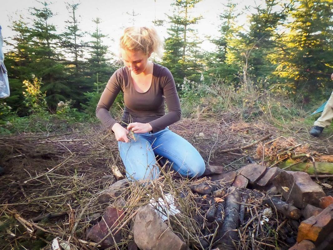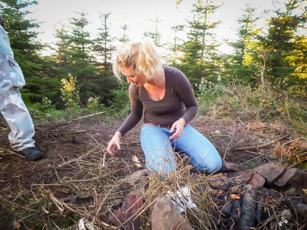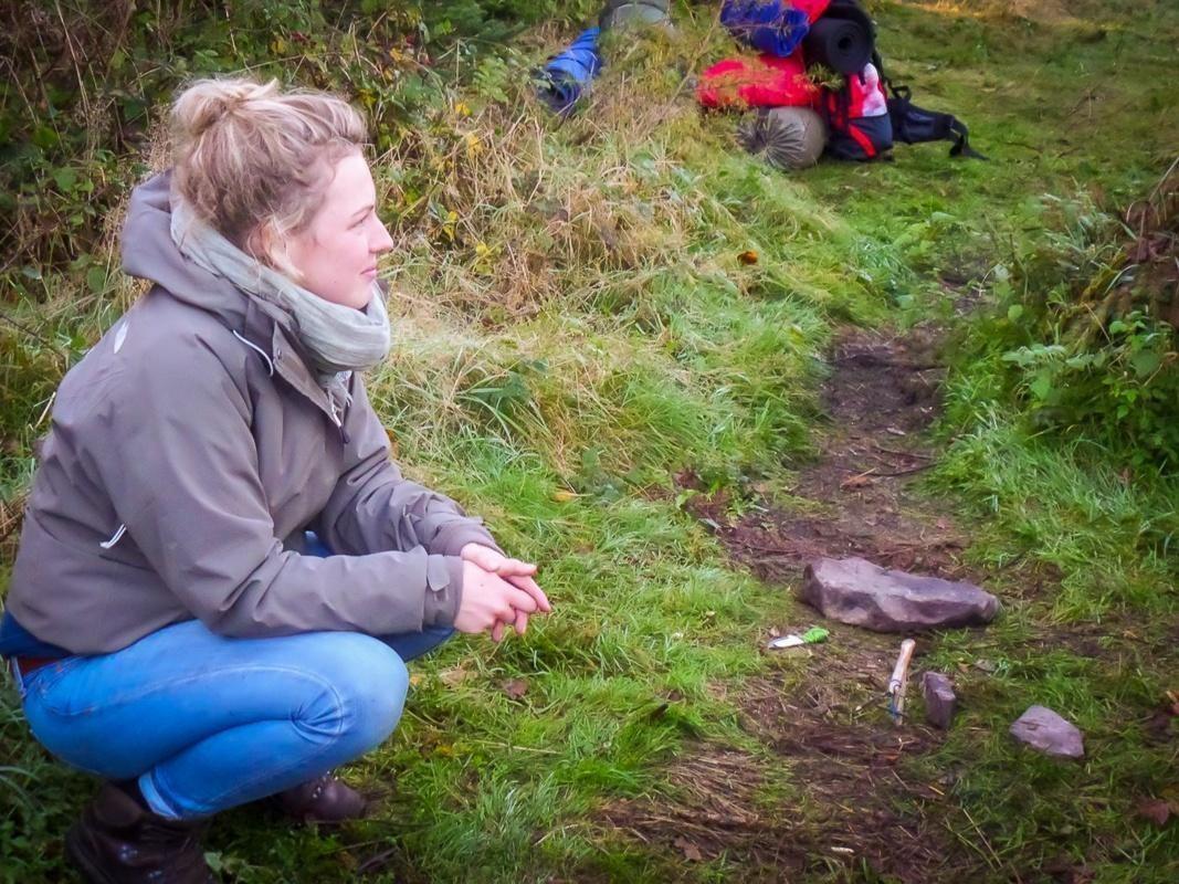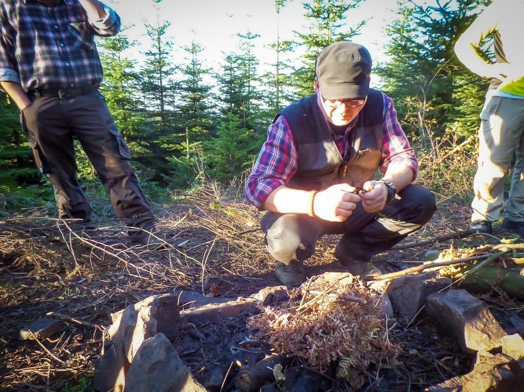 Gruppierung von vier Personen um eine kleine Feuerstelle im Wald, einer kniet vor der Feuerstelle