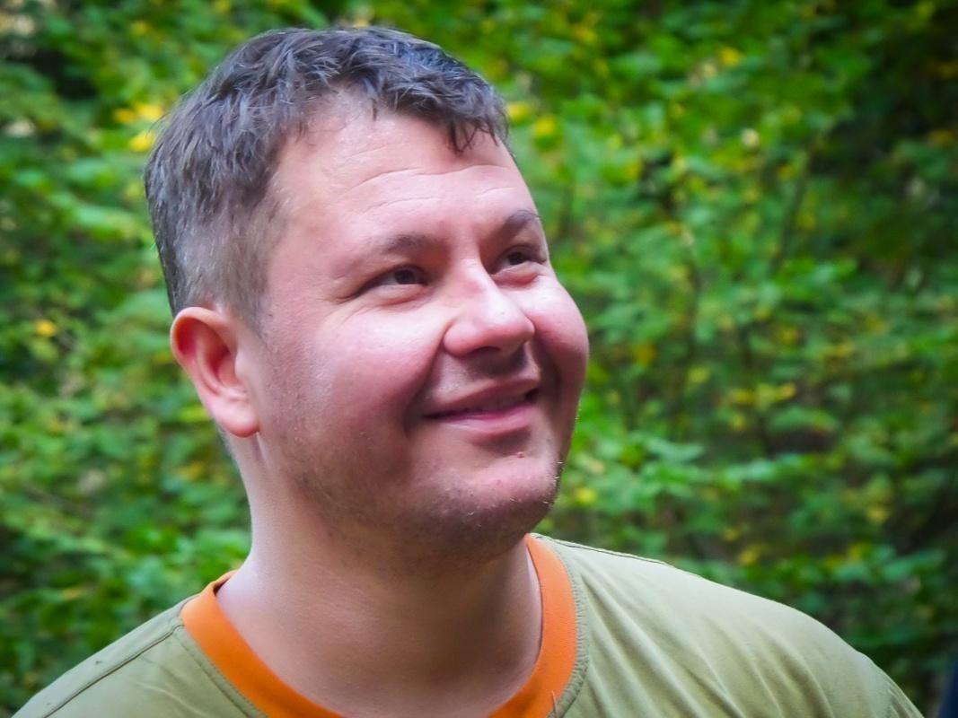 Lächelnde Person mit kurzem Haar vor grüner Waldkulisse