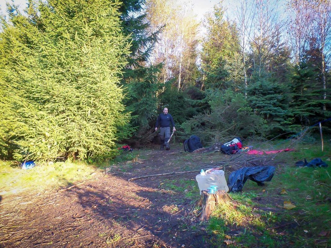 Lagerplatz mit Ausrüstung, Holzstück und Person im Wald