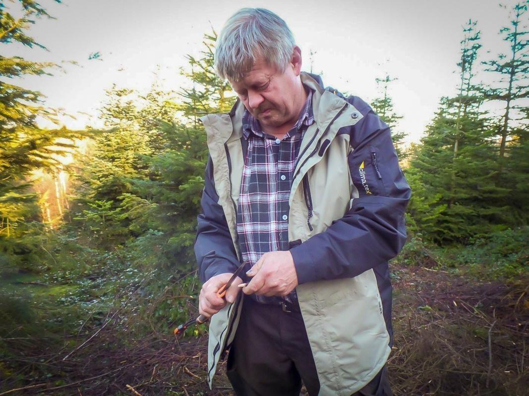 Mann bearbeitet ein Werkzeug in einem Waldgebiet zwischen Nadelbäumen