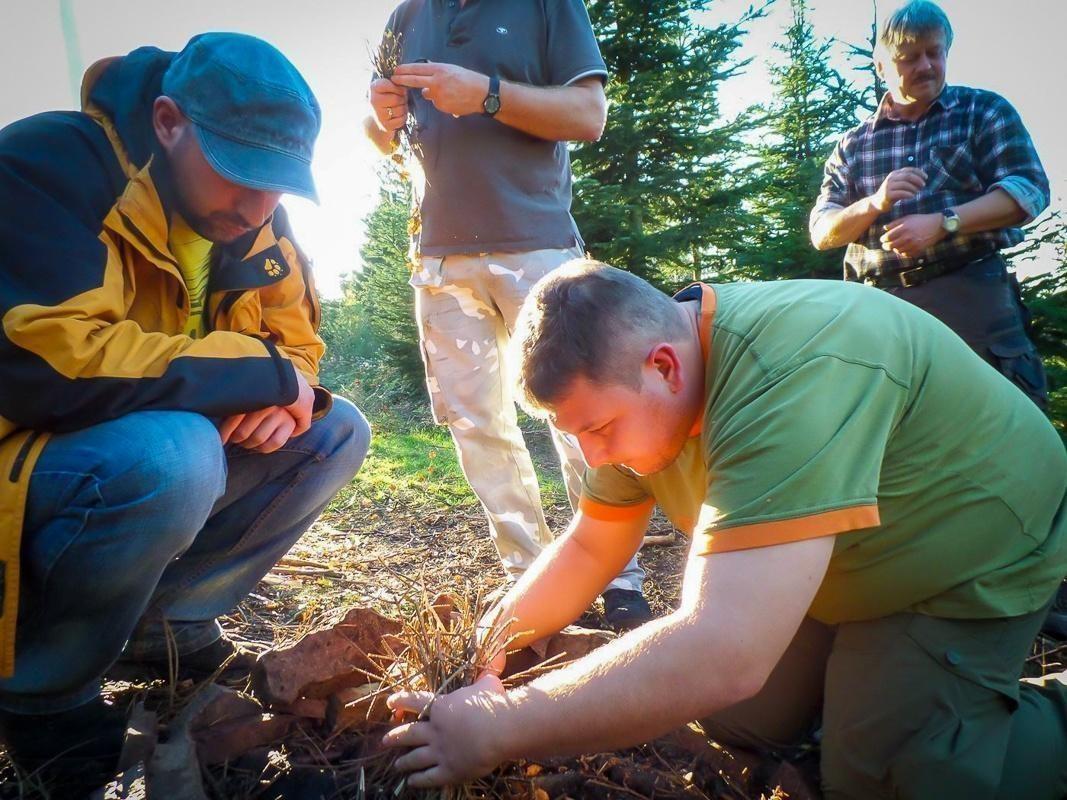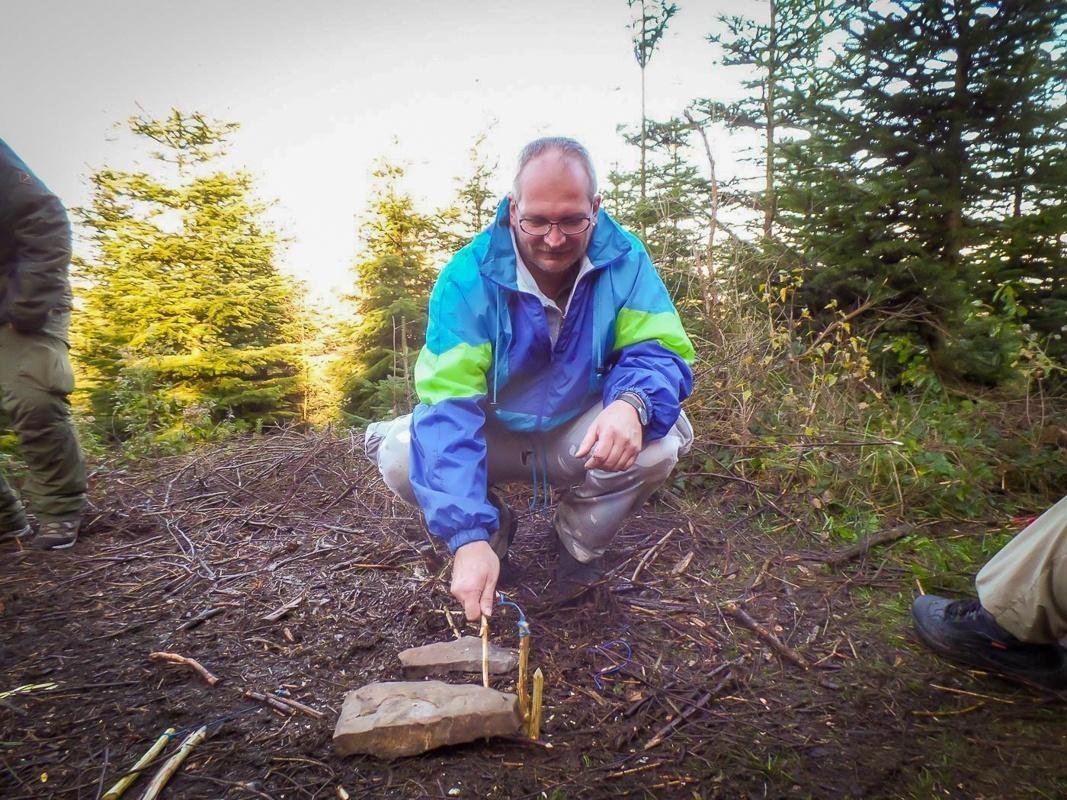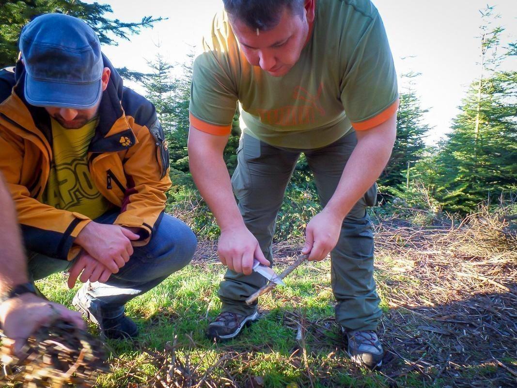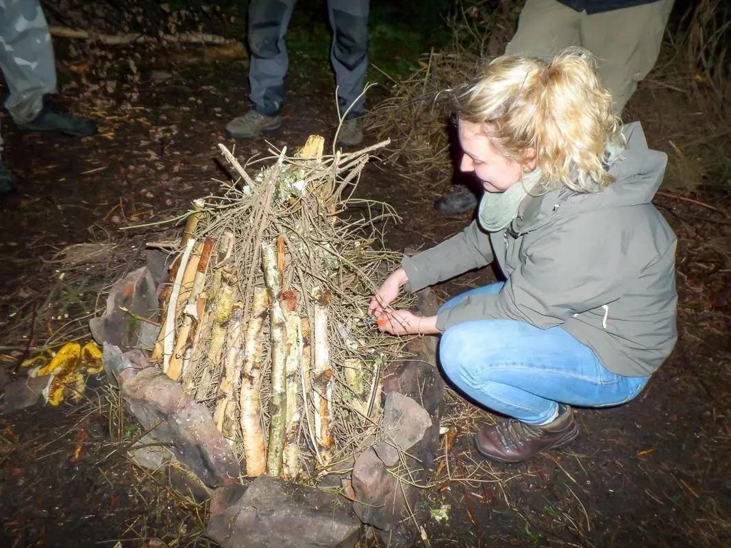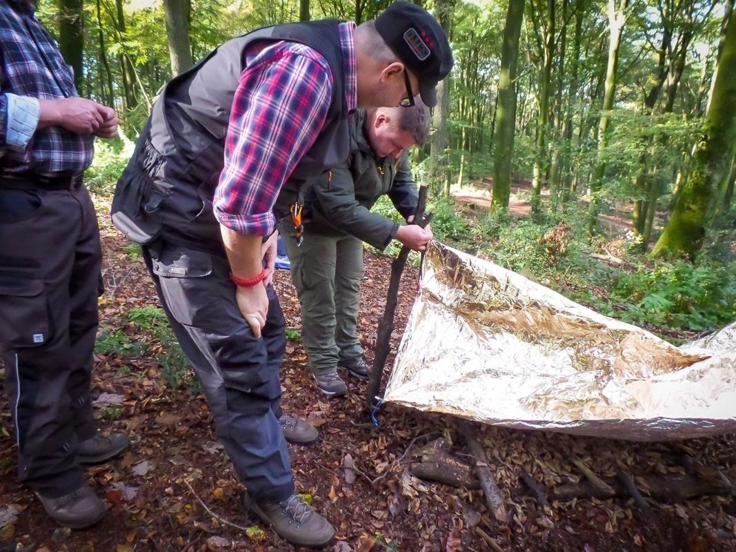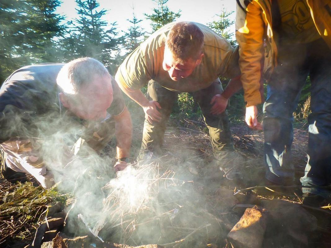 Ein weiterer zentraler Punkt des Kurses war der Bau eines Unterstands oder Wetterschutzes. Die Teilnehmer beschäftigten sich intensiv damit, wie sie aus Ästen und Zweigen eine stabile Struktur errichten konnten, die sie vor den Elementen schützte. Diese praktische Übung förderte nicht nur das handwerkliche Geschick, sondern auch das Verständnis für die Notwendigkeit eines sicheren Rückzugsortes in der Wildnis. Während des Trainings wurde auch das Feuermachen geübt, wobei die Teilnehmer lernten, wie man mit verschiedenen Materialien ein Feuer entfachen kann, um Wärme und Licht zu erzeugen sowie Nahrung zuzubereiten.