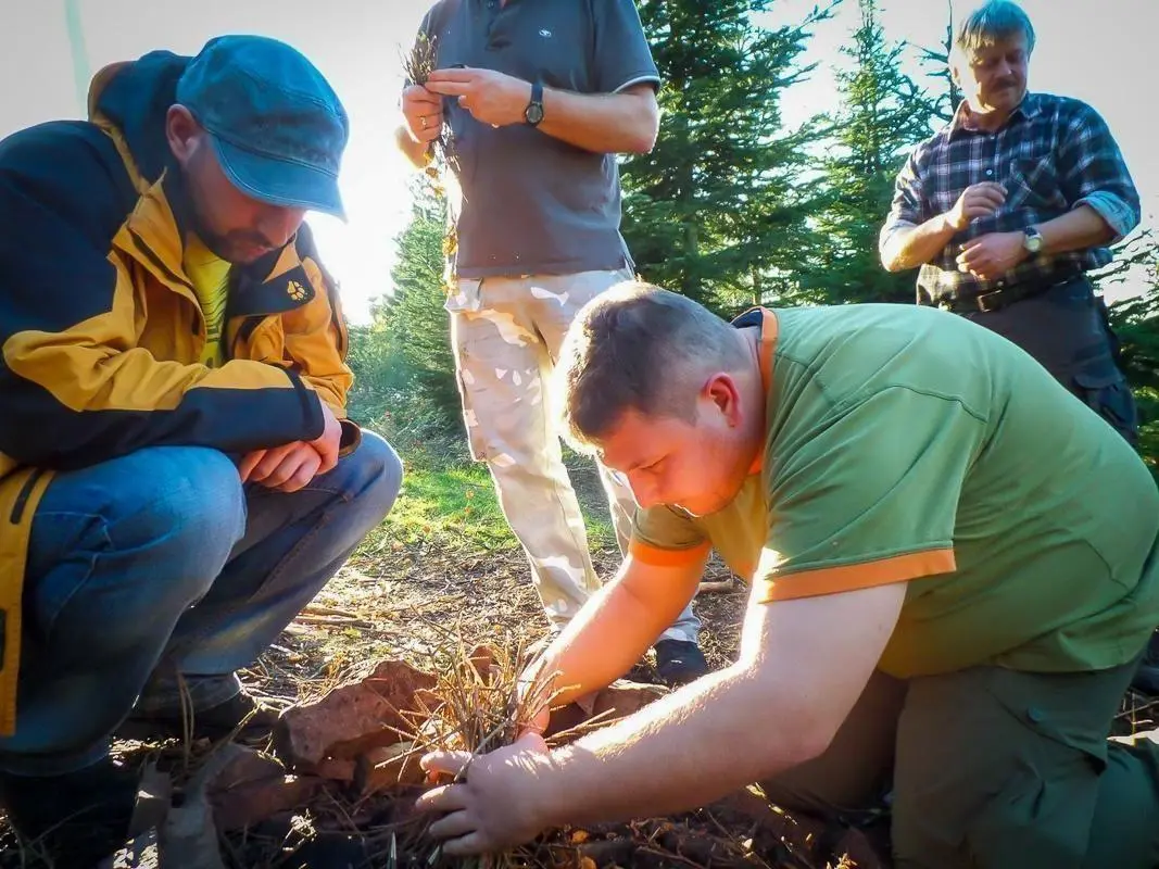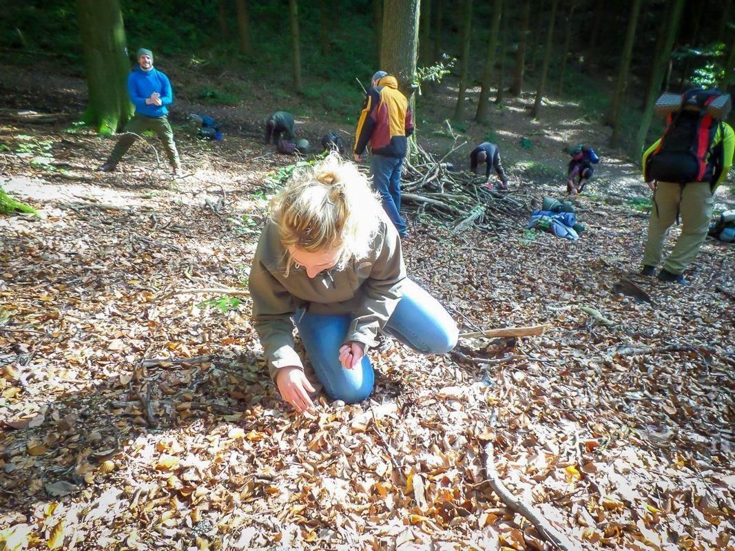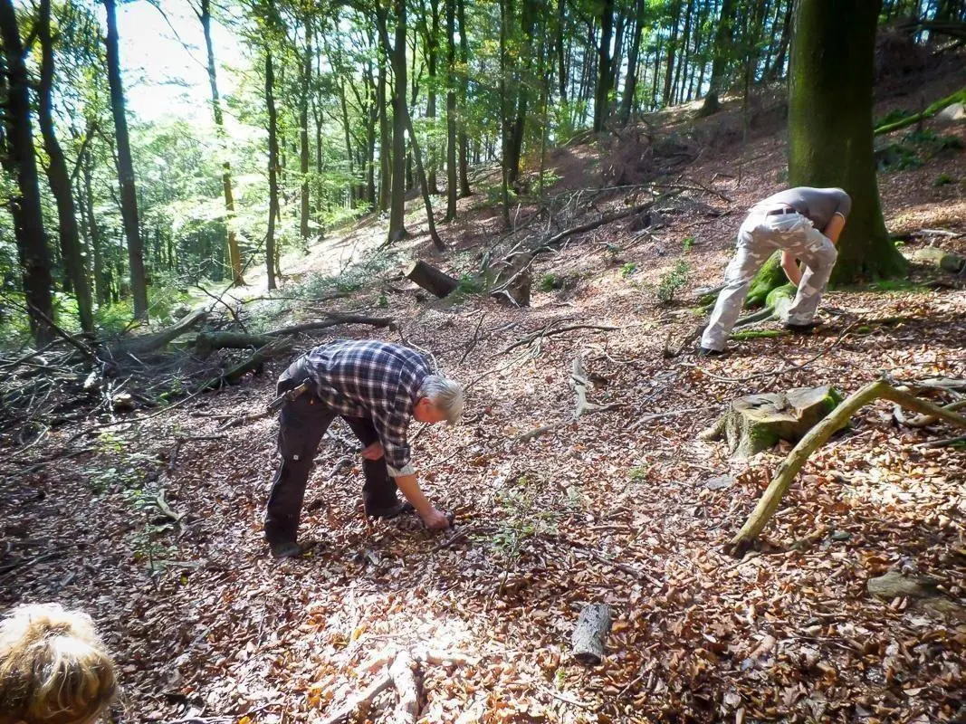 Zwei Personen untersuchen den Boden im Wald, umgeben von Bäumen und Laub