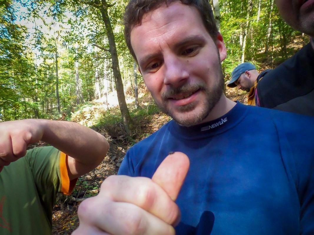 Mann betrachtet seinen Daumen im Wald, Hände von anderen Personen im Hintergrund