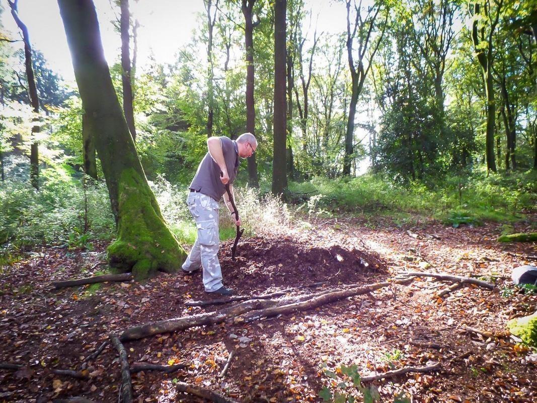 Mann gräbt mit einer Schaufel in einem Waldgebiet