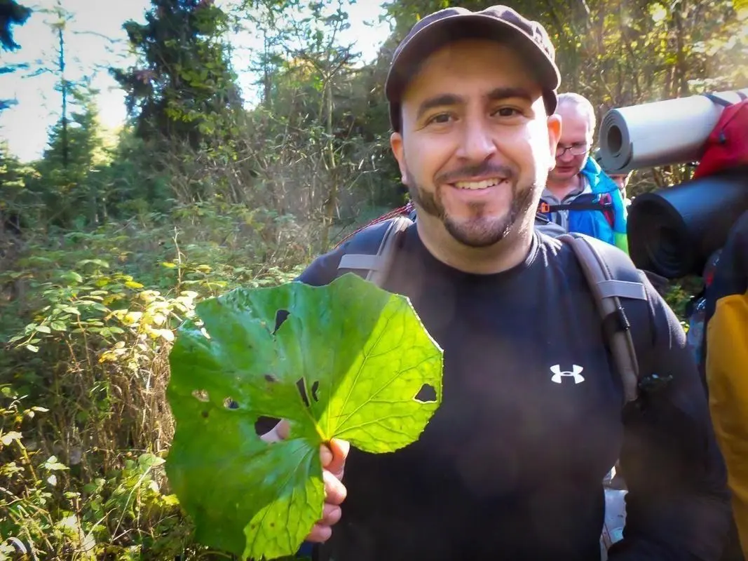Mann hält großes Blatt in der Hand, im Hintergrund Rucksackträger