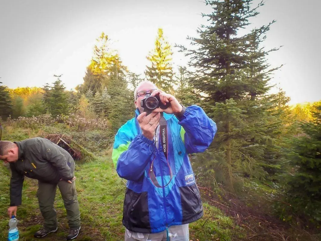 Mann mit Brille und Kamera im Wald, unscharfer Hintergrund