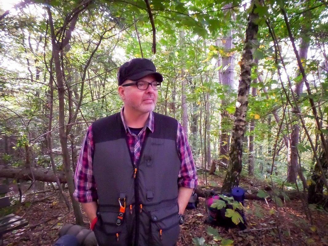 Mann in Wald mit Outdoor-Bekleidung und Ausrüstung, umgeben von Bäumen