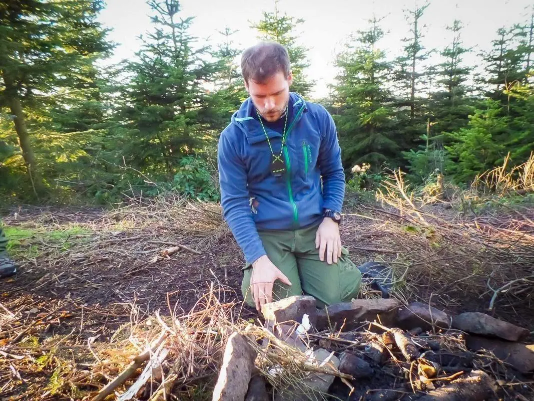 Mann kniet neben einem kleinen Feuerplatz mit Holz und Zunder