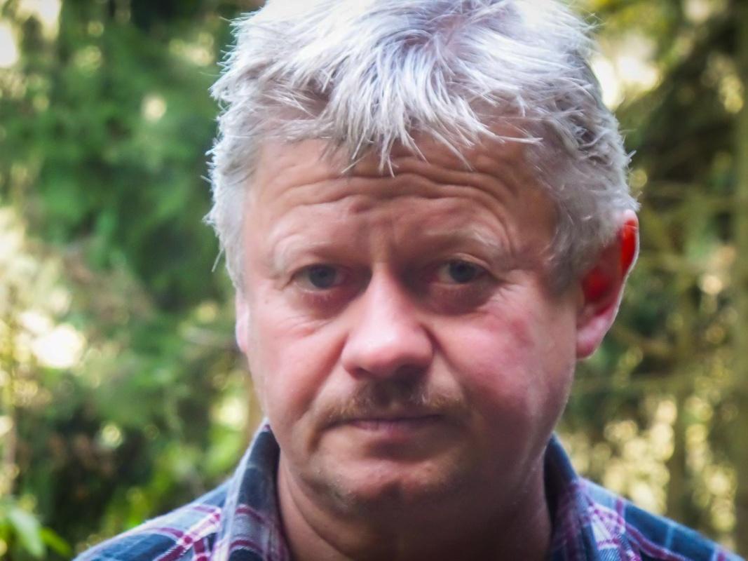 Mann mit grauen Haaren und kariertem Hemd vor grüner Hintergrundvegetation