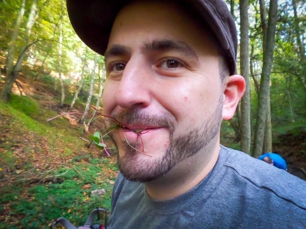 Mann mit Zweigen im Mund lächelt in einem Waldgebiet
