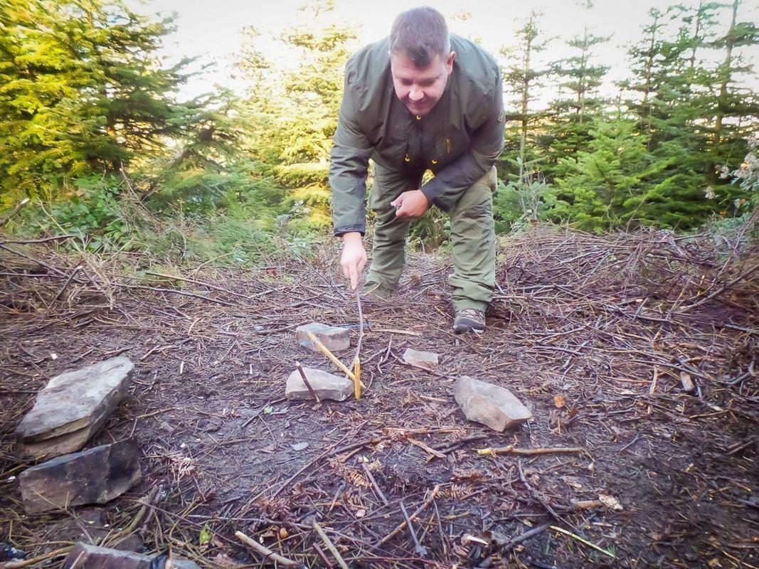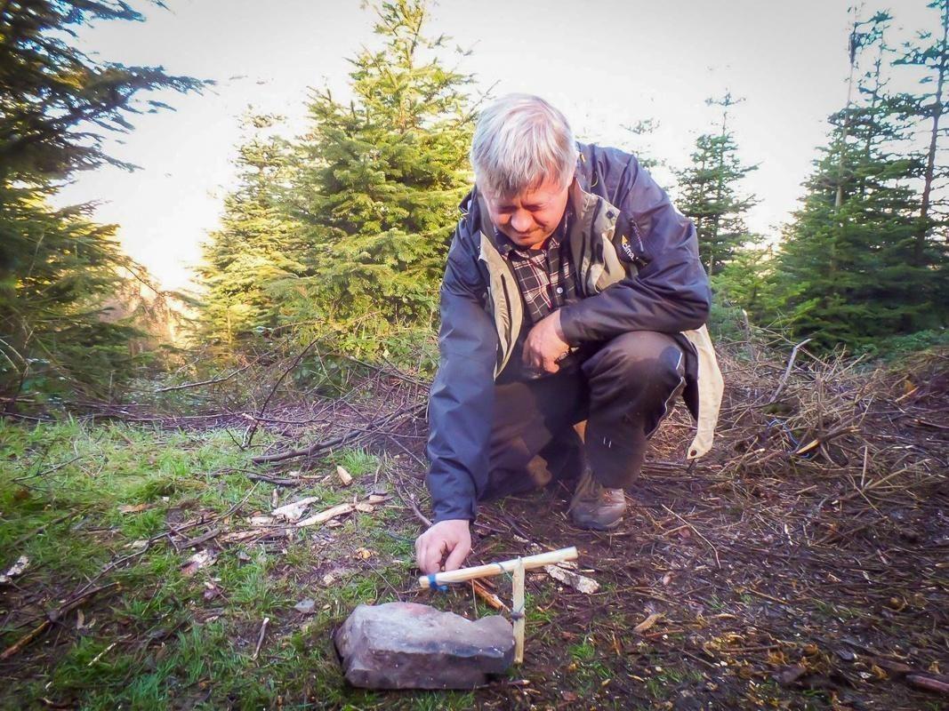 Mann kniet neben einem großen Stein und Holzstücken im Wald