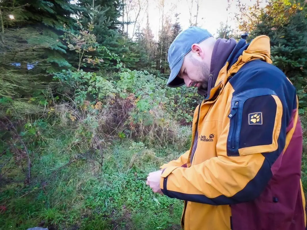 Mann prüft Ausrüstung in bewaldeter Umgebung