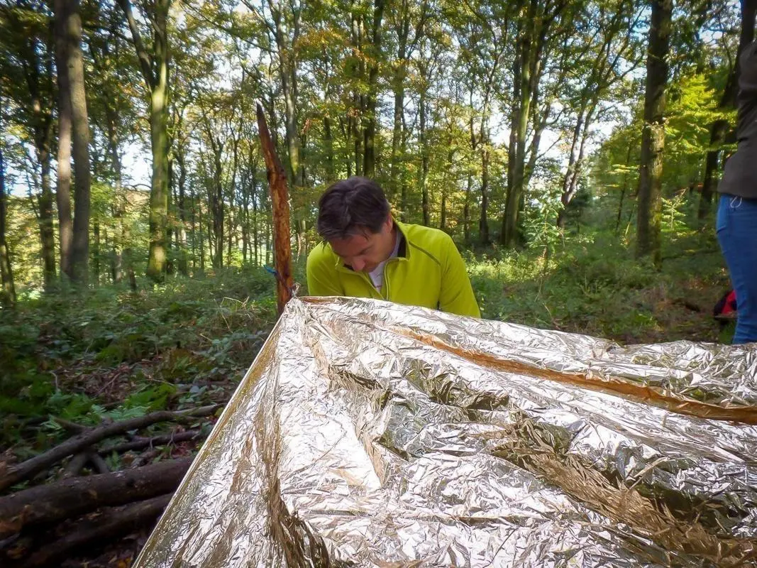 Person befestigt eine reflektierende Notunterkunft im Wald