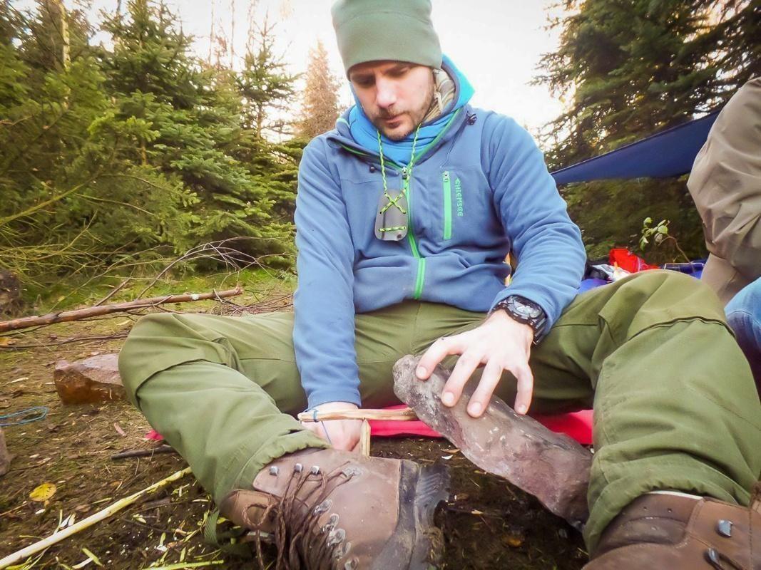 Mann zündet Zunder mit einem Feuerstahl auf einem Stein