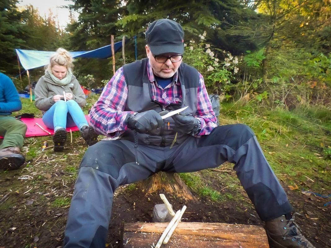 Zunder wird mit einem Messer bearbeitet, während ein Feuerplatz im Hintergrund sichtbar ist