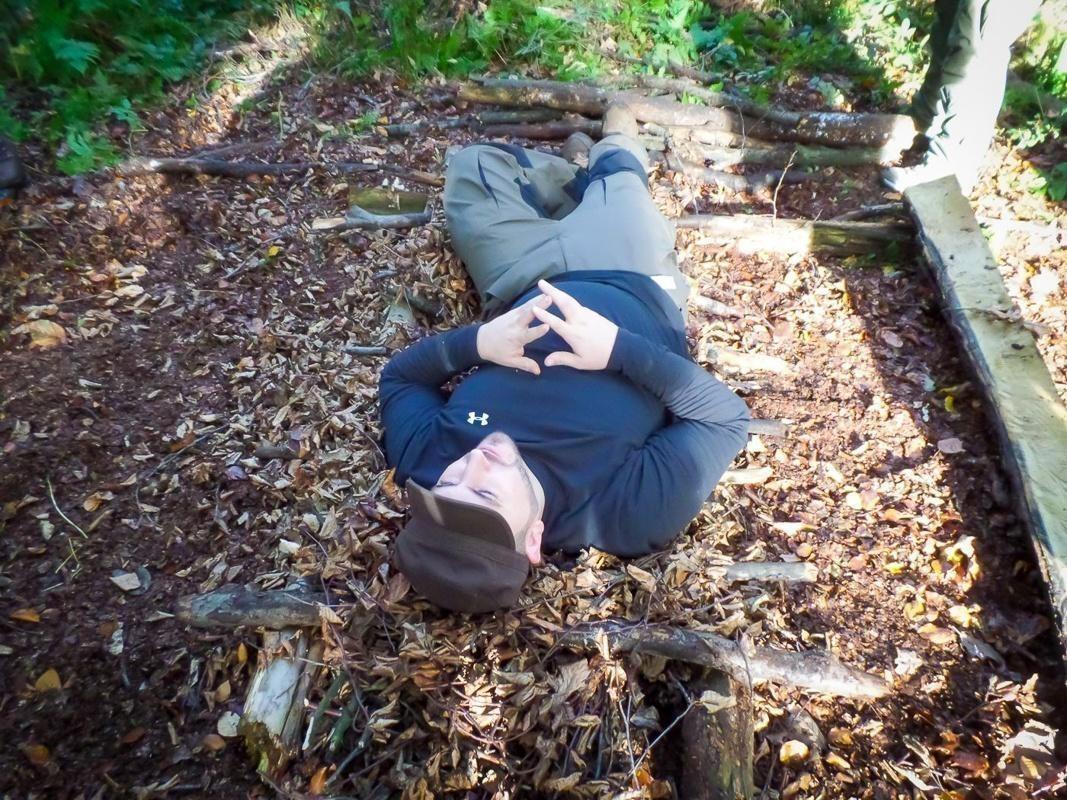 Person liegt auf einer improvisierten Liege aus Ästen und Laub im Wald