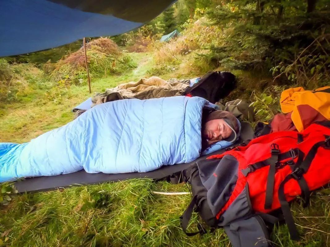 Schlafsack liegt auf Isomatte, umgeben von Rucksäcken und Decken