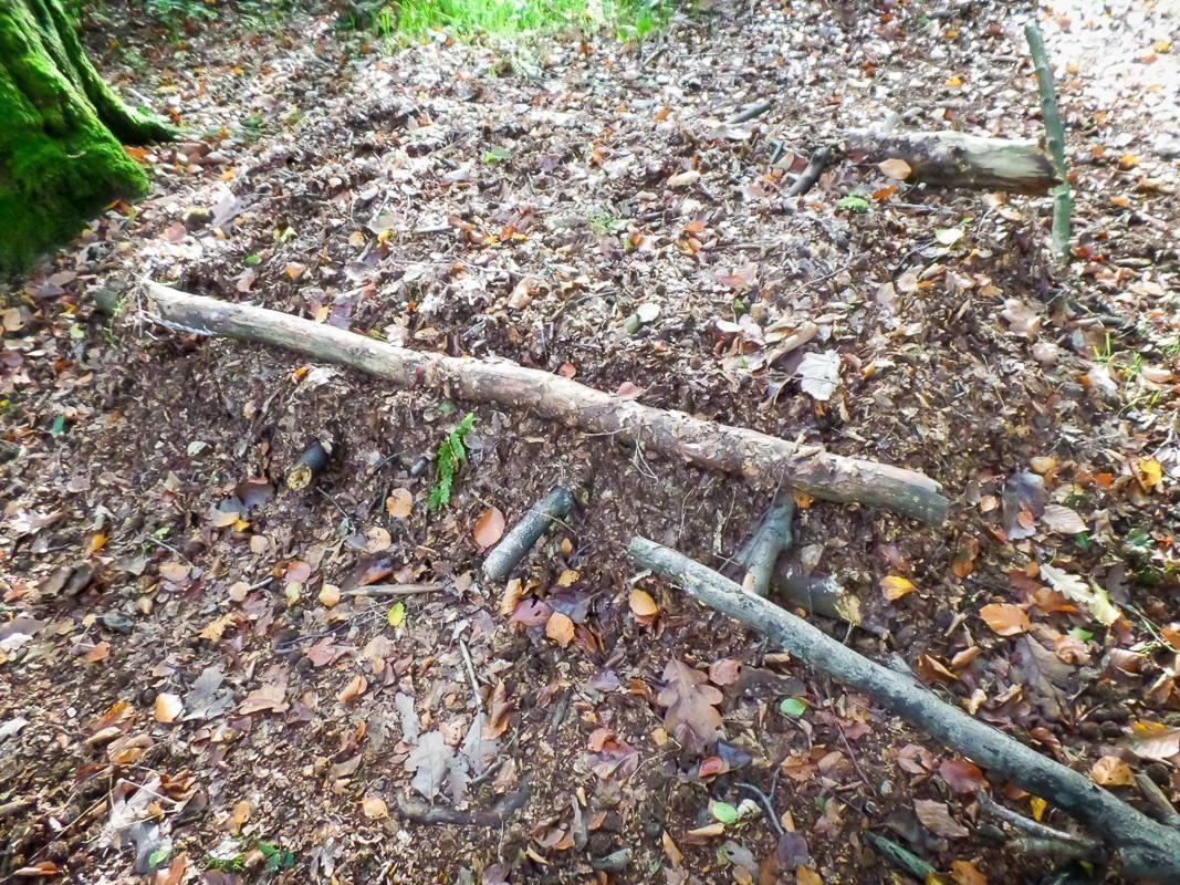 Selbstgebaute Konstruktion aus Ästen und Laub im Wald