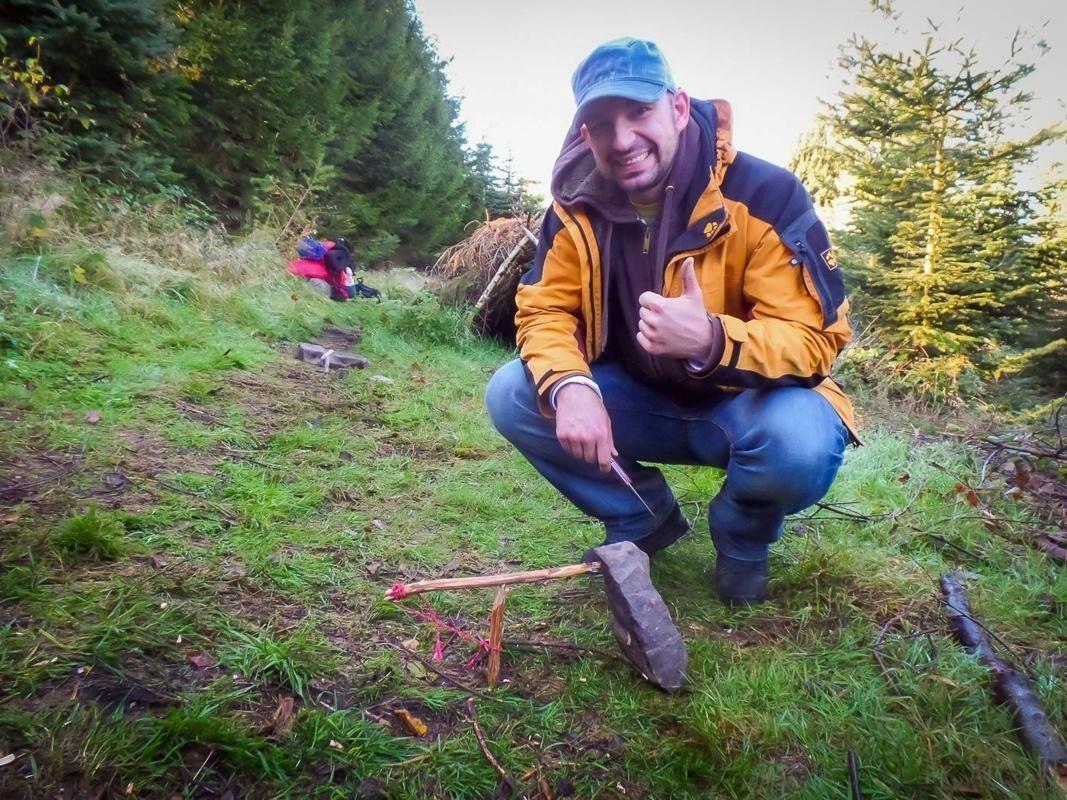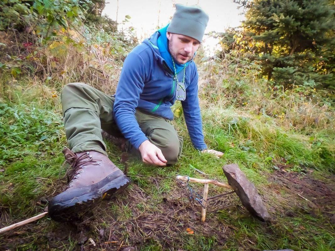 Mann positioniert einen Stock auf einem Stein zur Konstruktion einer Schlagfalle